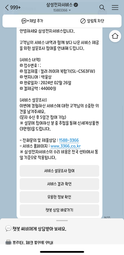 서비스 이용 후 결제금액은 44000원이었습니다. 삼성 컬러 레이저 복합기 SL-C563FW 모델 부품이 서비스 내에 있어 당일에 수리를 받을 수 있었습니다. 서비스모델 제품 부품이 서비스센터 내에 없을 시에는 시간이 더 소요된다는 점 참고하세요!
