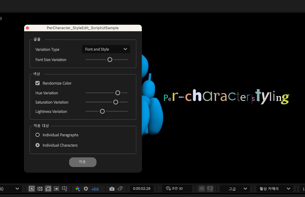 스크립팅을 사용하여 텍스트 레이어 내 문자의 모양과 애니메이션을 보다 세밀하게 제어할 수 있습니다.