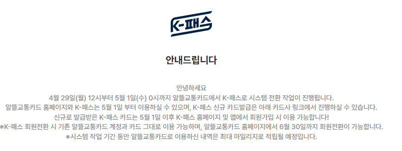 알뜰교통카드가 K-패스로 시스템 전환을 진행합니다. 이 전환은 4월 29일부터 시작되어 5월 1일에 완료될 예정입니다. 이 시스템 전환으로 인해 알뜰교통카드 이용자들은 K-패스의 혜택을 받을 수 있게 됩니다.