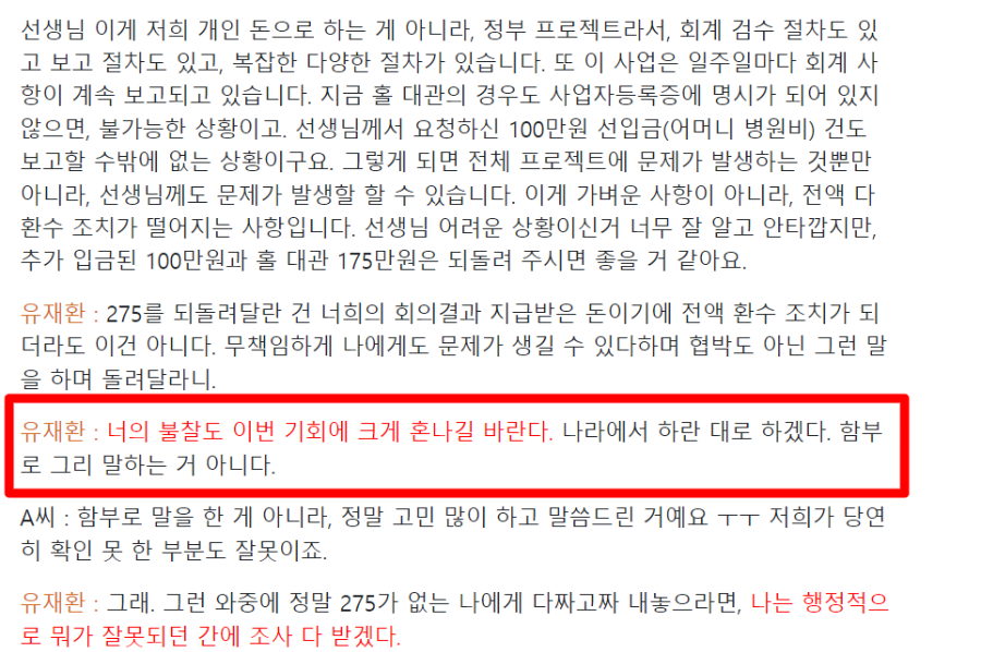유재환은 해산물 전문점 2층에 위치한 작업실을 쇼케이스 장소로 제안하며 자립준비청년들에게 175만 원의 대관료를 받았습니다. 추가로 개인 돈 100만 원까지 빌린 후, 총 275만 원을 반환하라는 요청에 화를 내며 대응했습니다.
